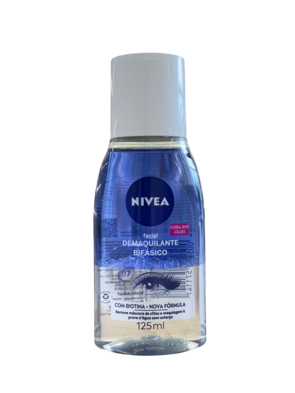 Demaquilante Bifásico Nivea possui em sua fórmula óleo de girassol, sendo ideal para retirar a maquiagem à prova d’água, inclusive para fazer a remoção da máscara de cílios, tudo sem agredir a pele e as áreas mais delicadas do rosto, como por exemplo os olhos.