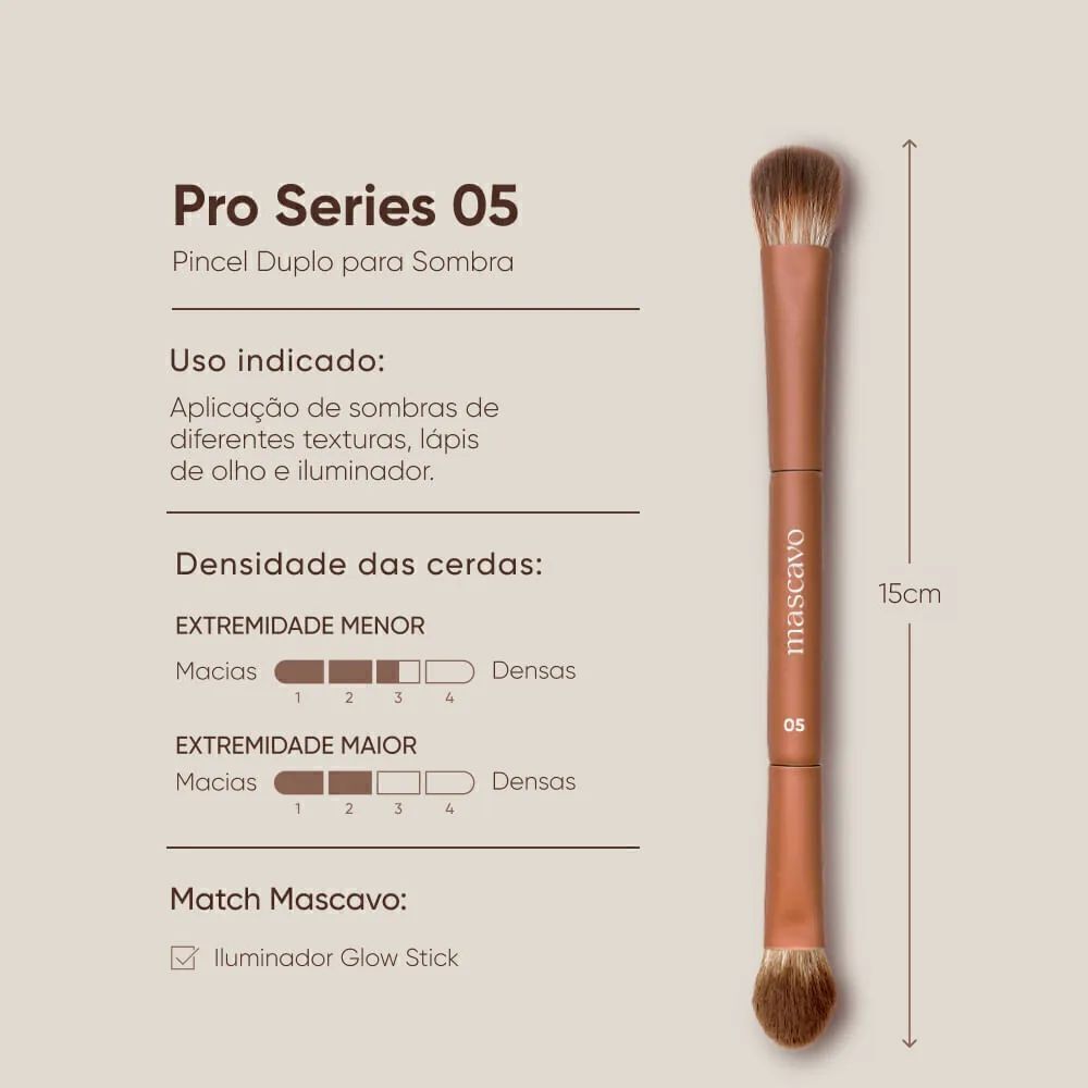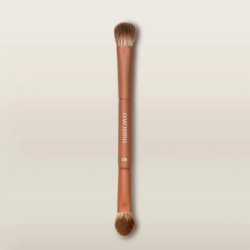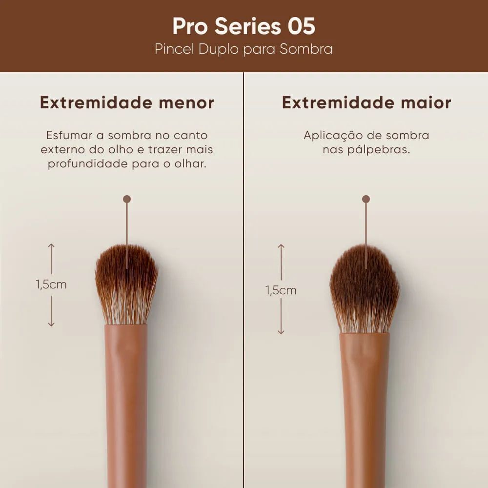 O pincel Mascavo Pro Series 05 Pincel de Maquiagem Duplo para Sombra possui duas extremidades com curvaturas perfeitas para aplicar e esfumar sombras com diferentes texturas.